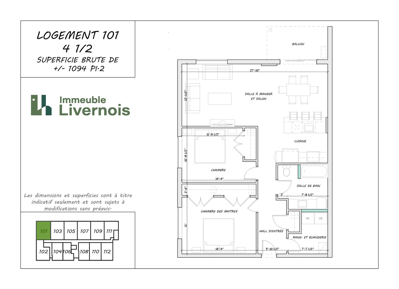 Le logement 101 est un 4 1/2 d’une superficie de 1 094 pieds carrés, offert au prix de 1 641,00 $ par mois, avec l’eau incluse ainsi que le chauffage et l’électricité.